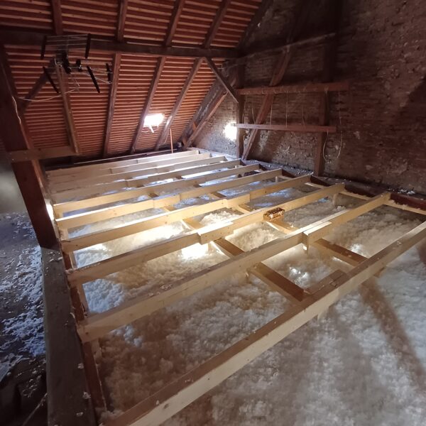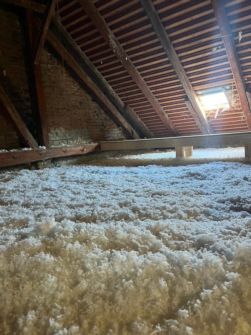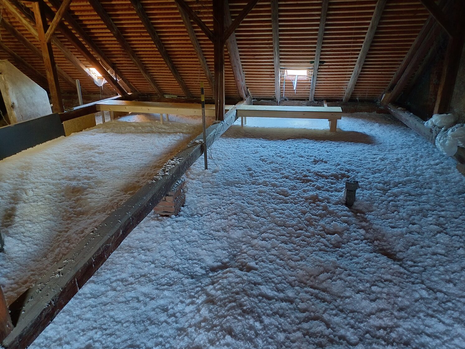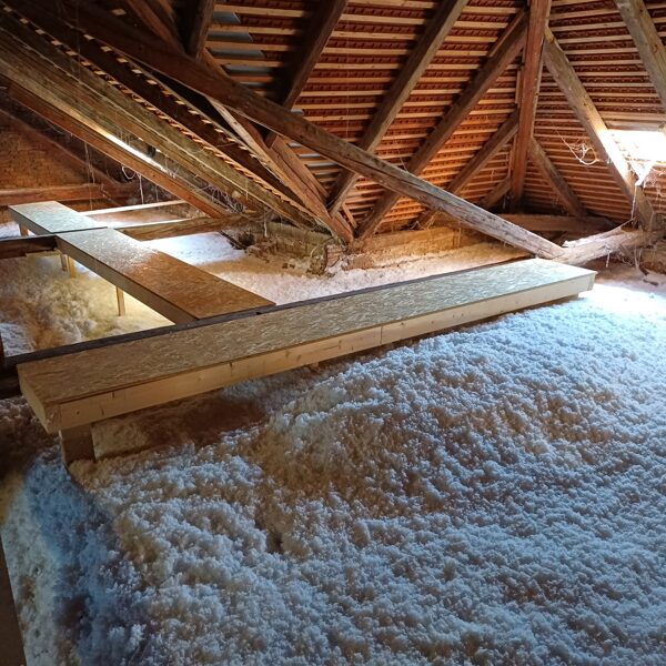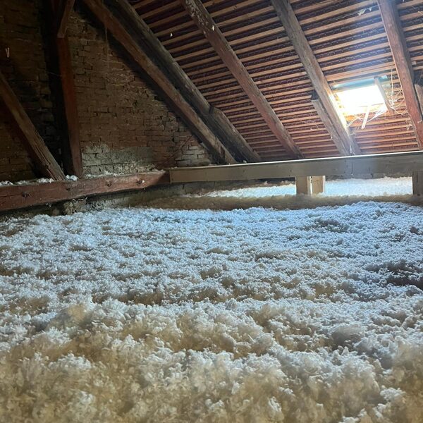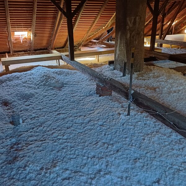 Rychlá a bezprahová aplikace – izolace se fouká přímo do střešních konstrukcí nebo mezi trámy, bez nutnosti složité rekonstrukce.