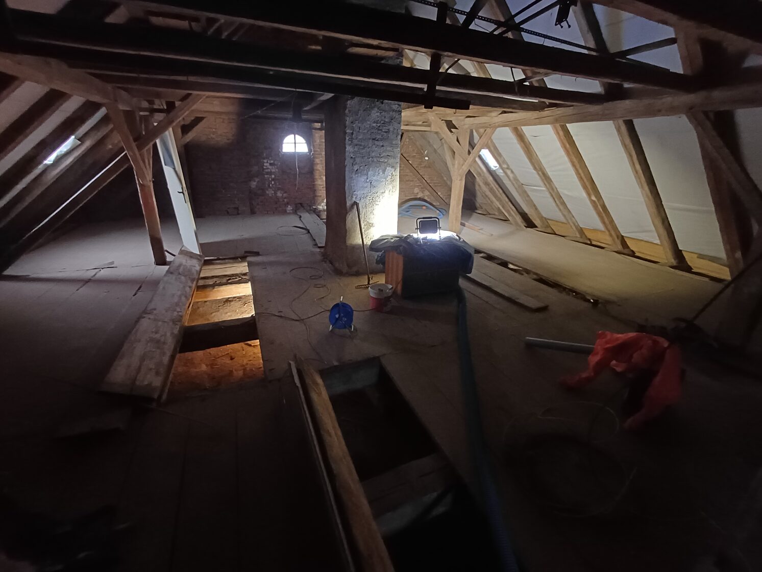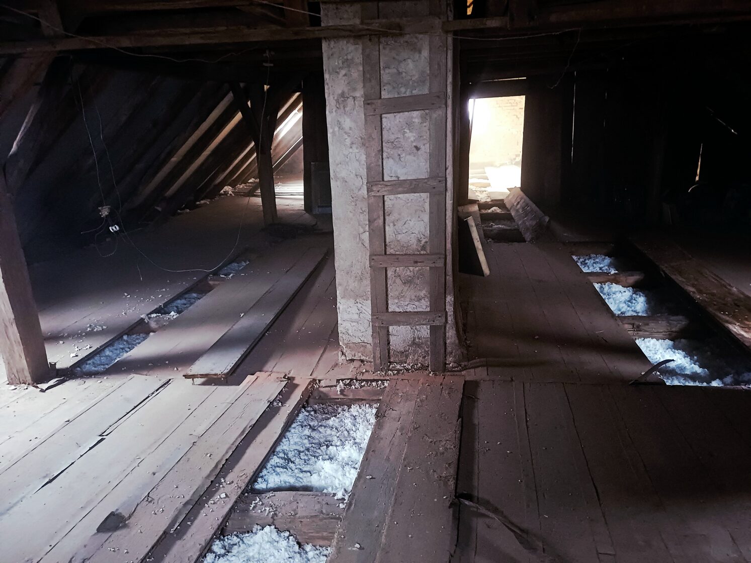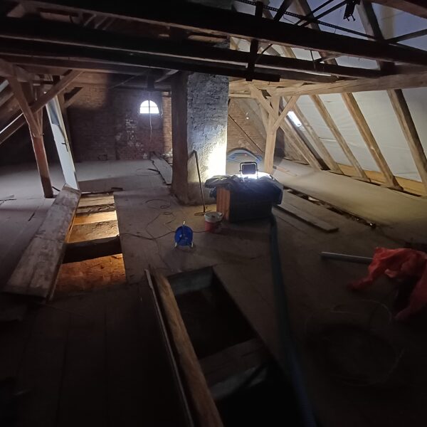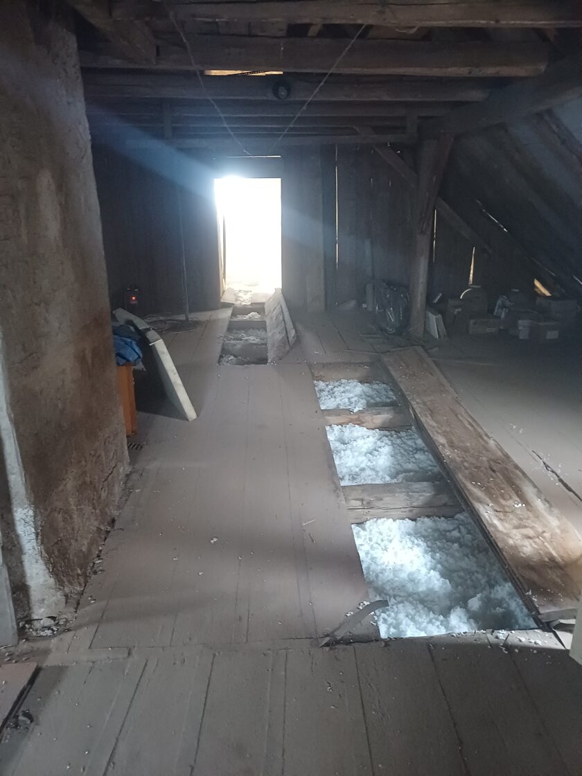 Zlepšení akustiky – foukaná izolace omezuje šíření hluku mezi podlažími a zlepšuje akustický komfort v obytných i provozních prostorách fary.